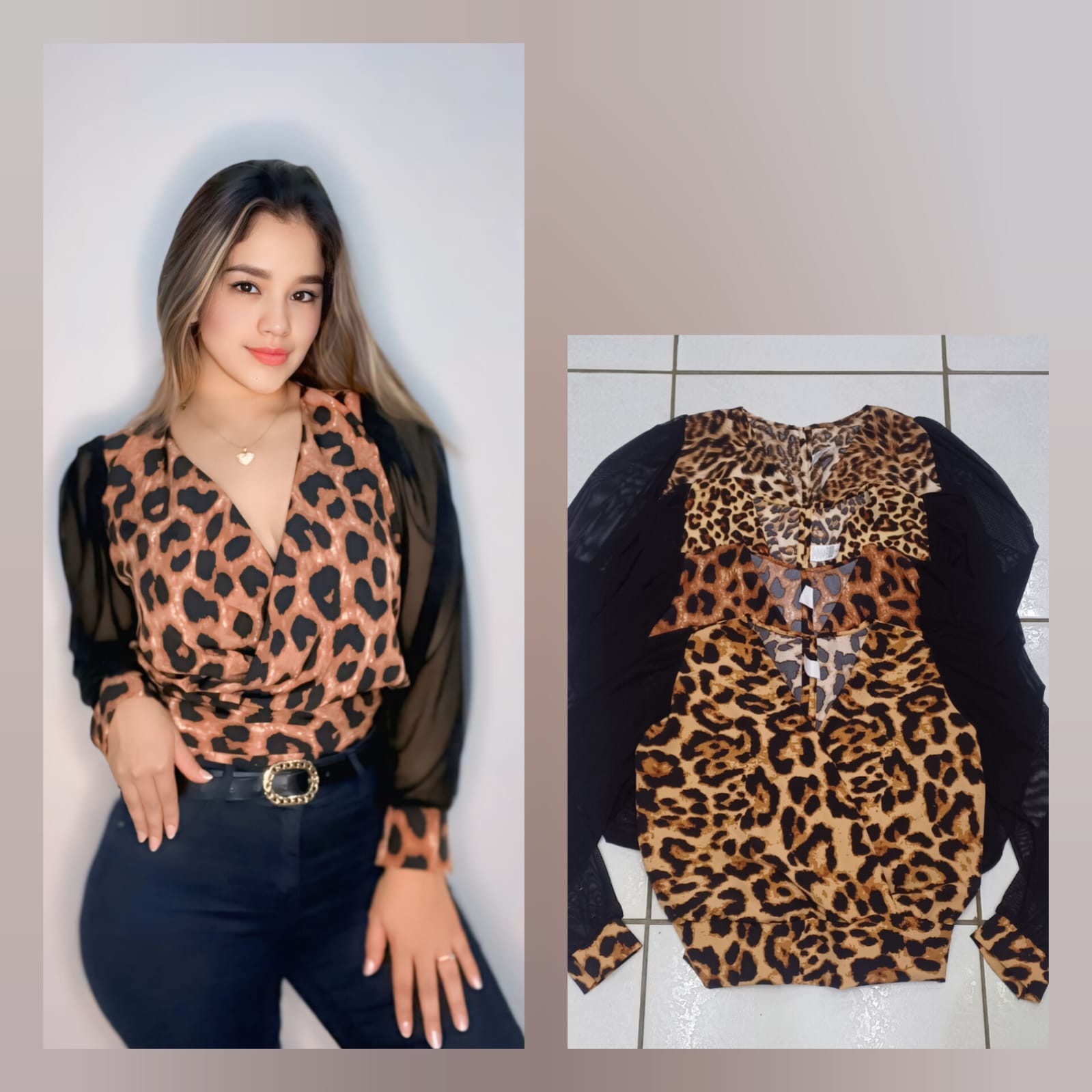 Remera animal print en lycra, combinada con tul en mangas.