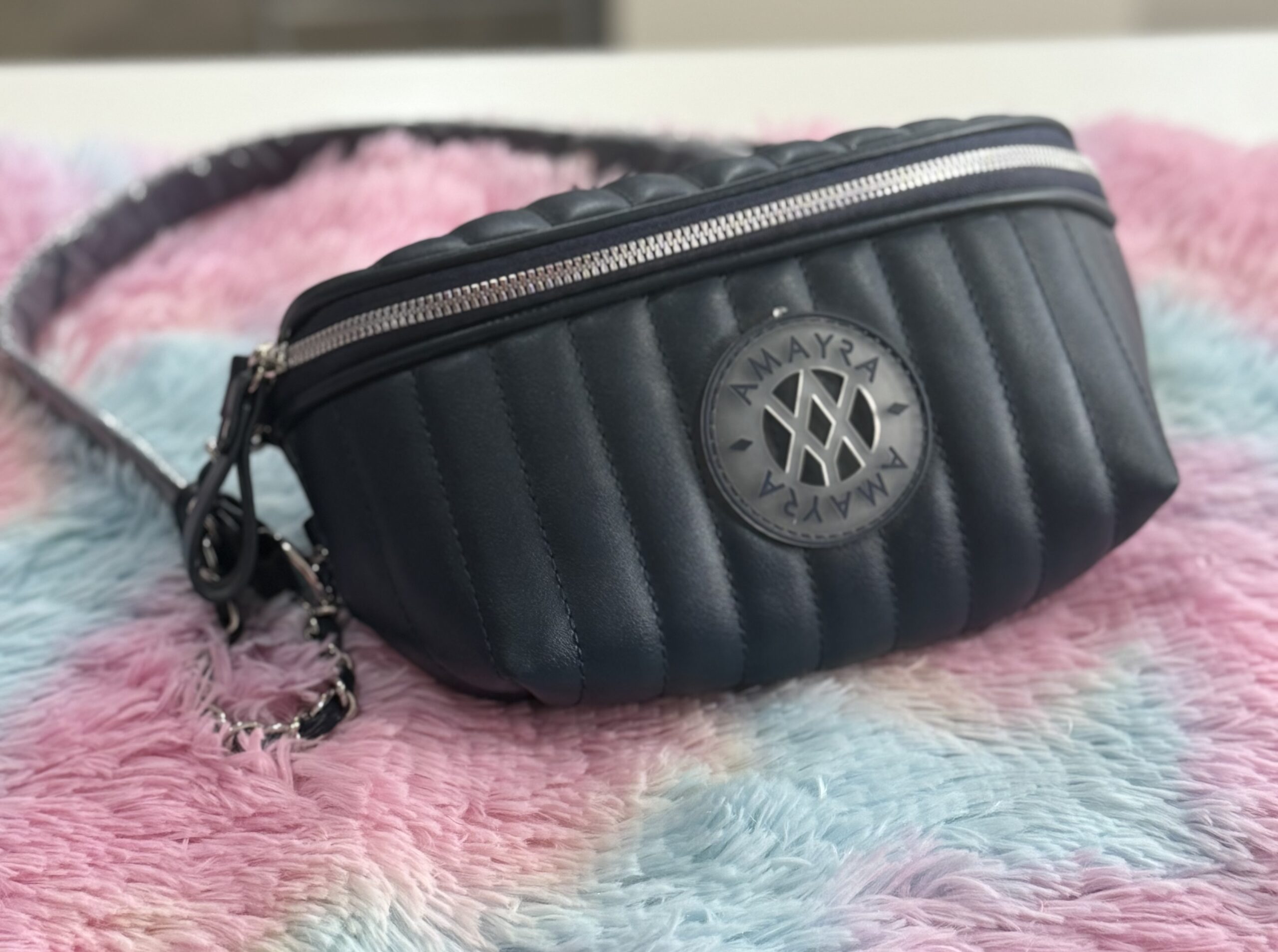 Rinonera Amayra azul con detalle de cadena en la correa.